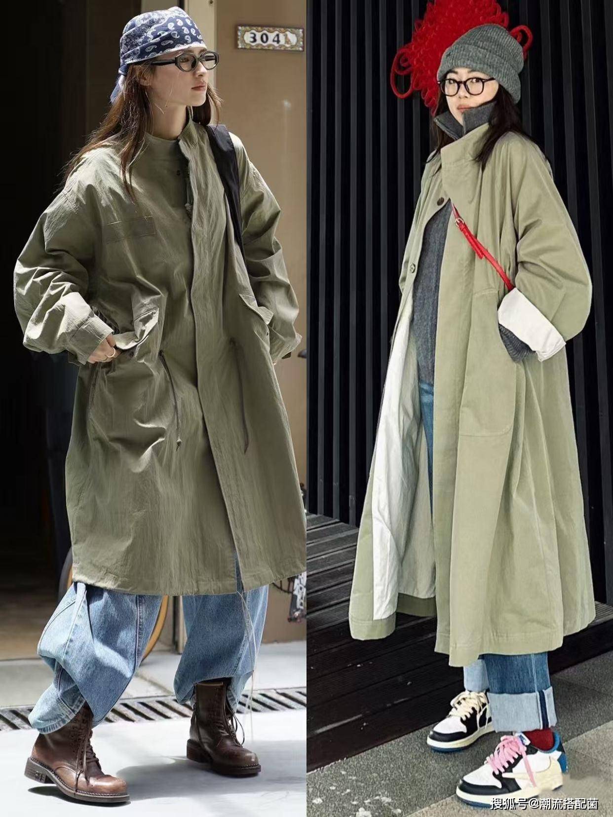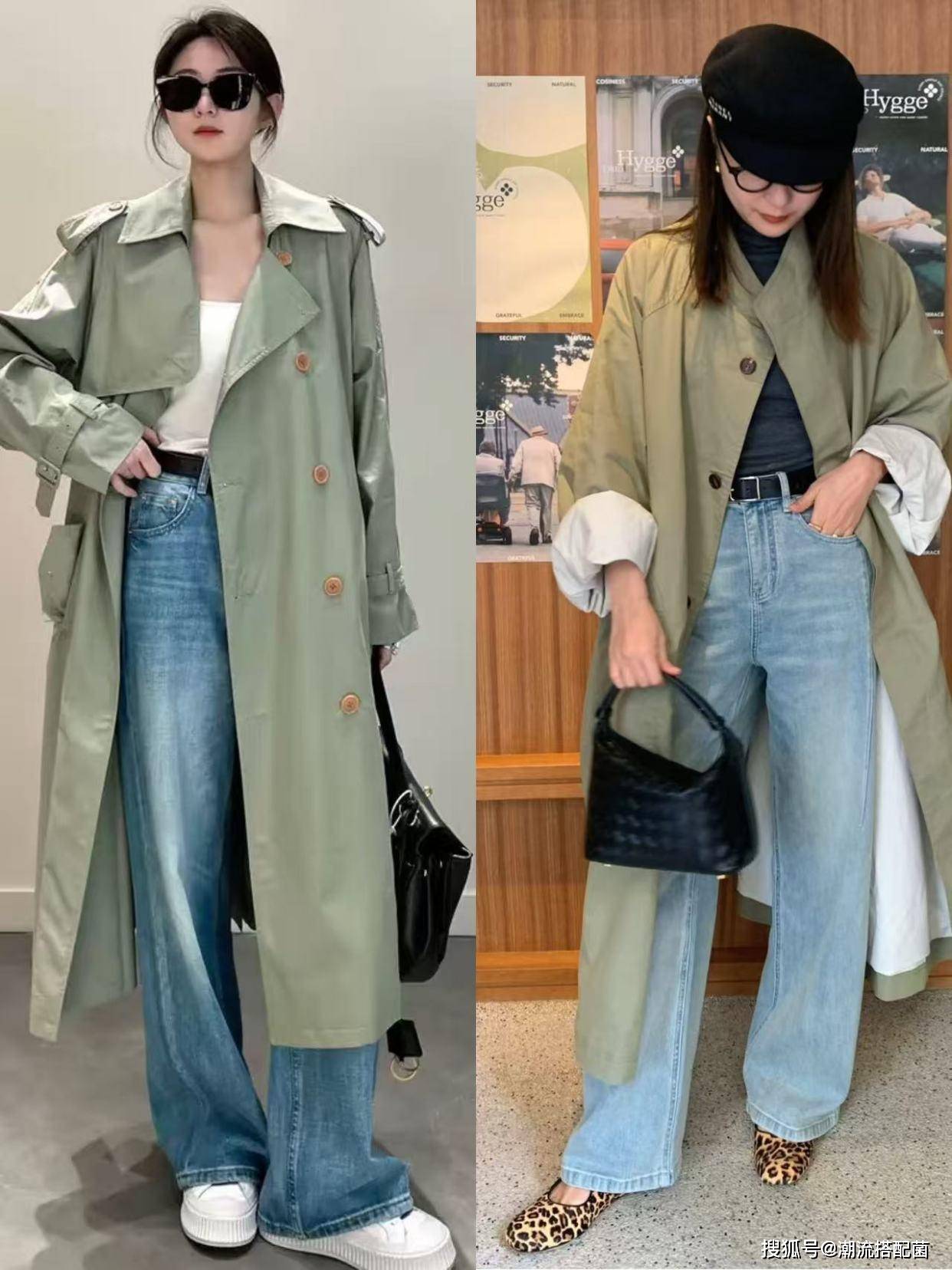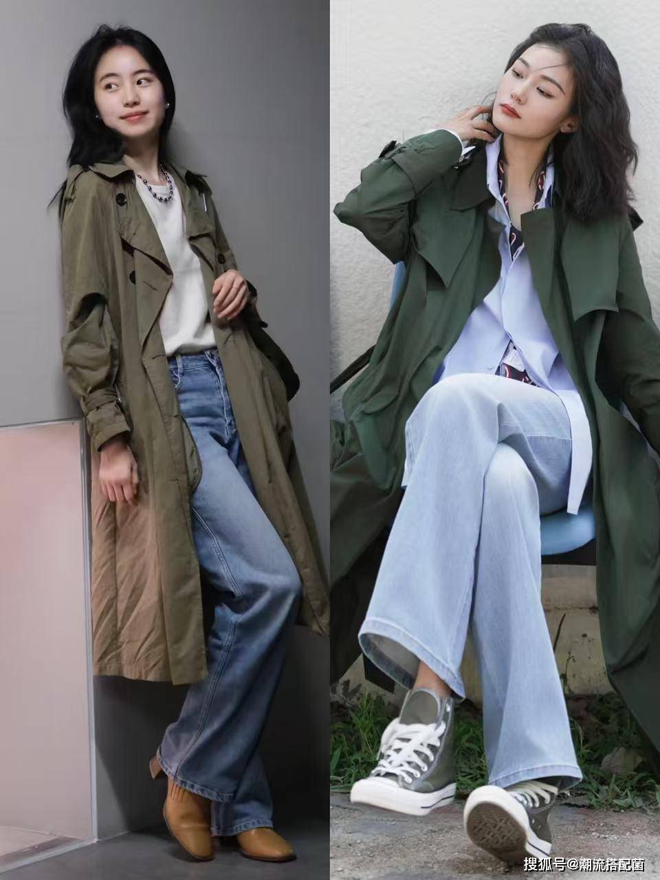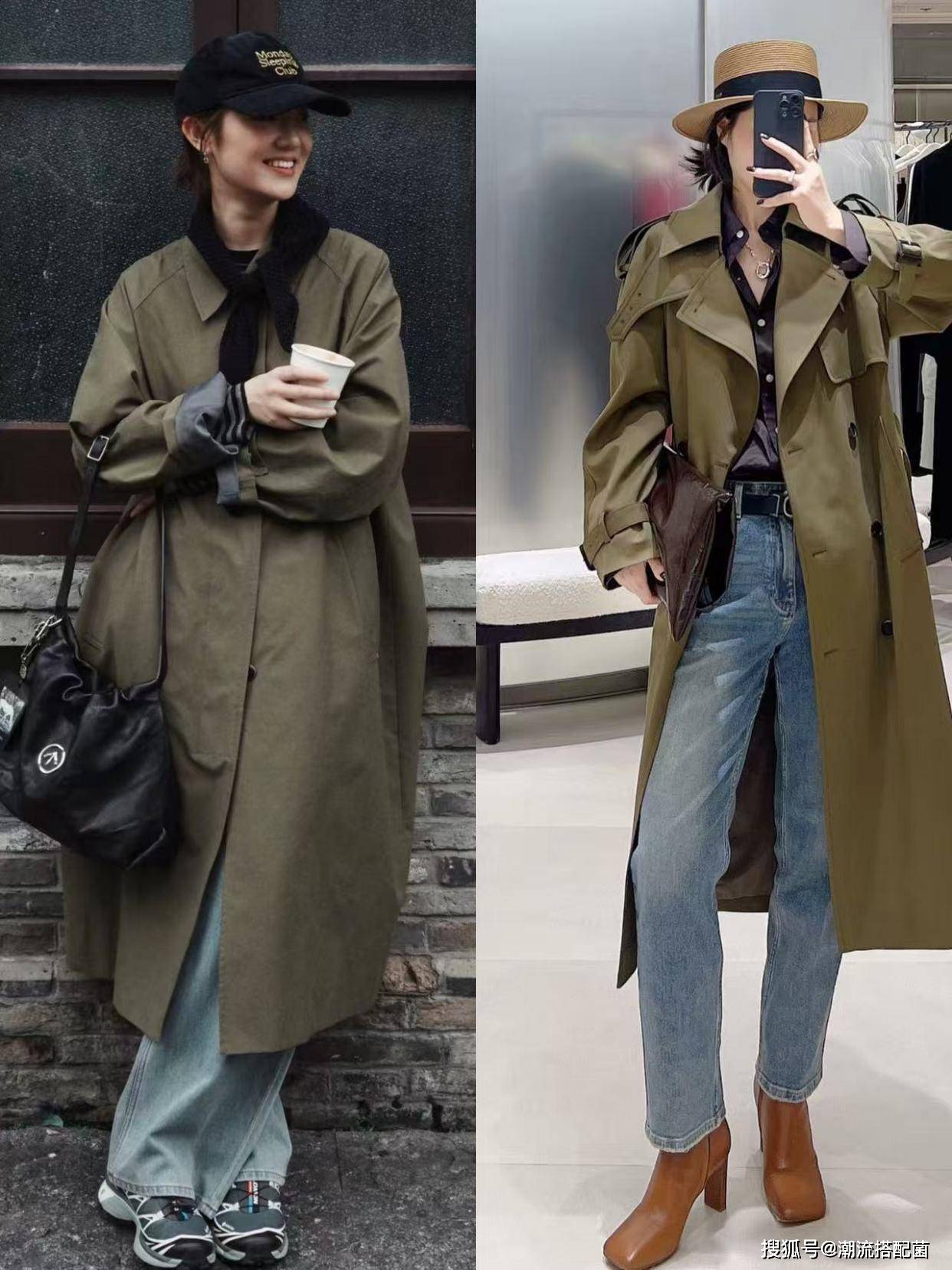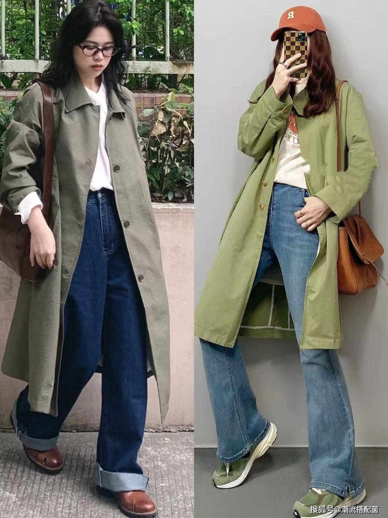 草木绿风衣+牛仔裤