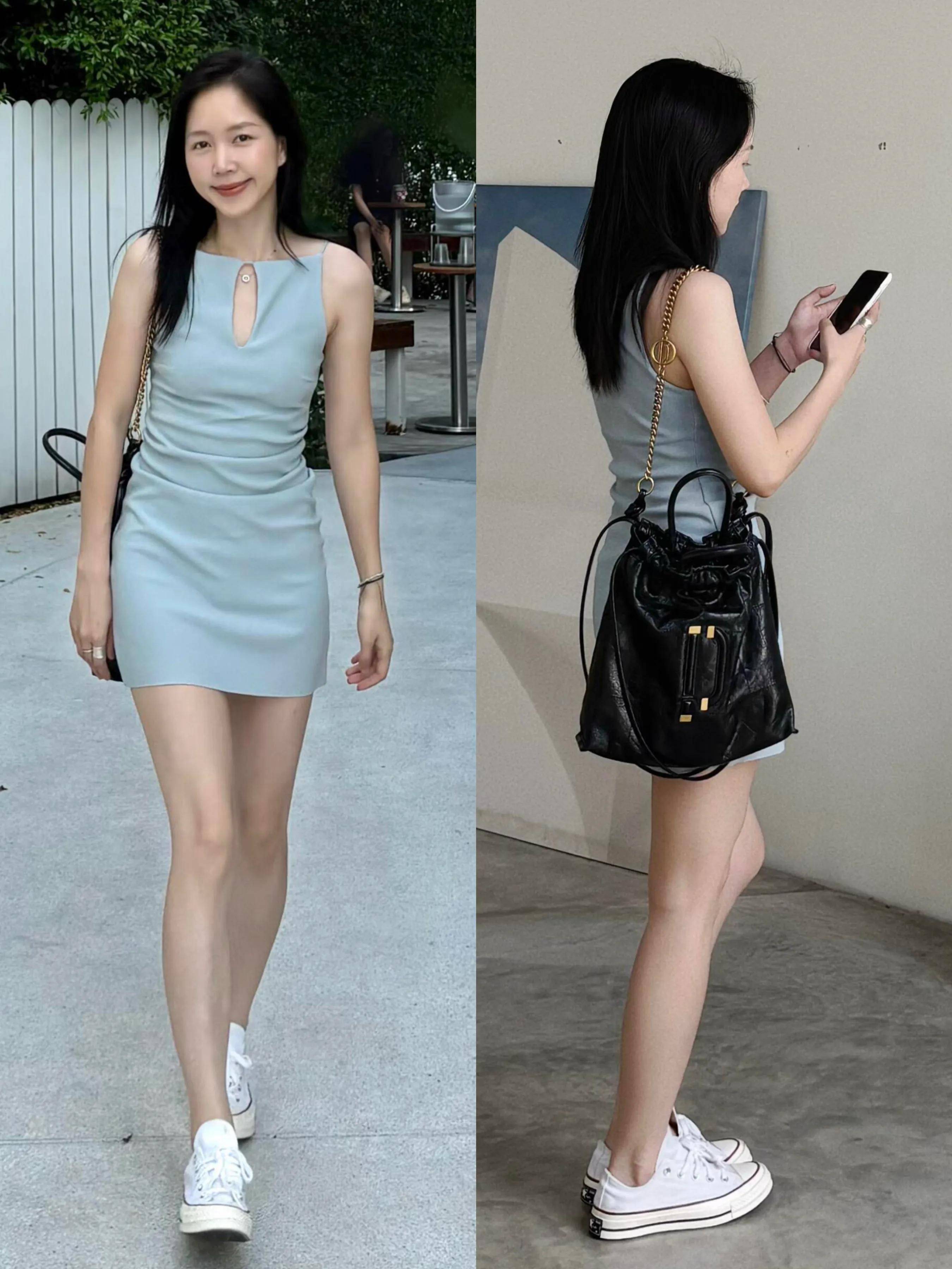 春暖花开的季节,春风吹来,裹挟着暖意,我们可以选择比较清爽的打扮风格,一条无袖的雾霾蓝连衣裙搭配白色的帆布鞋,挎的一款黑色链条包下衣时装穿法呈现出大长腿优势。
