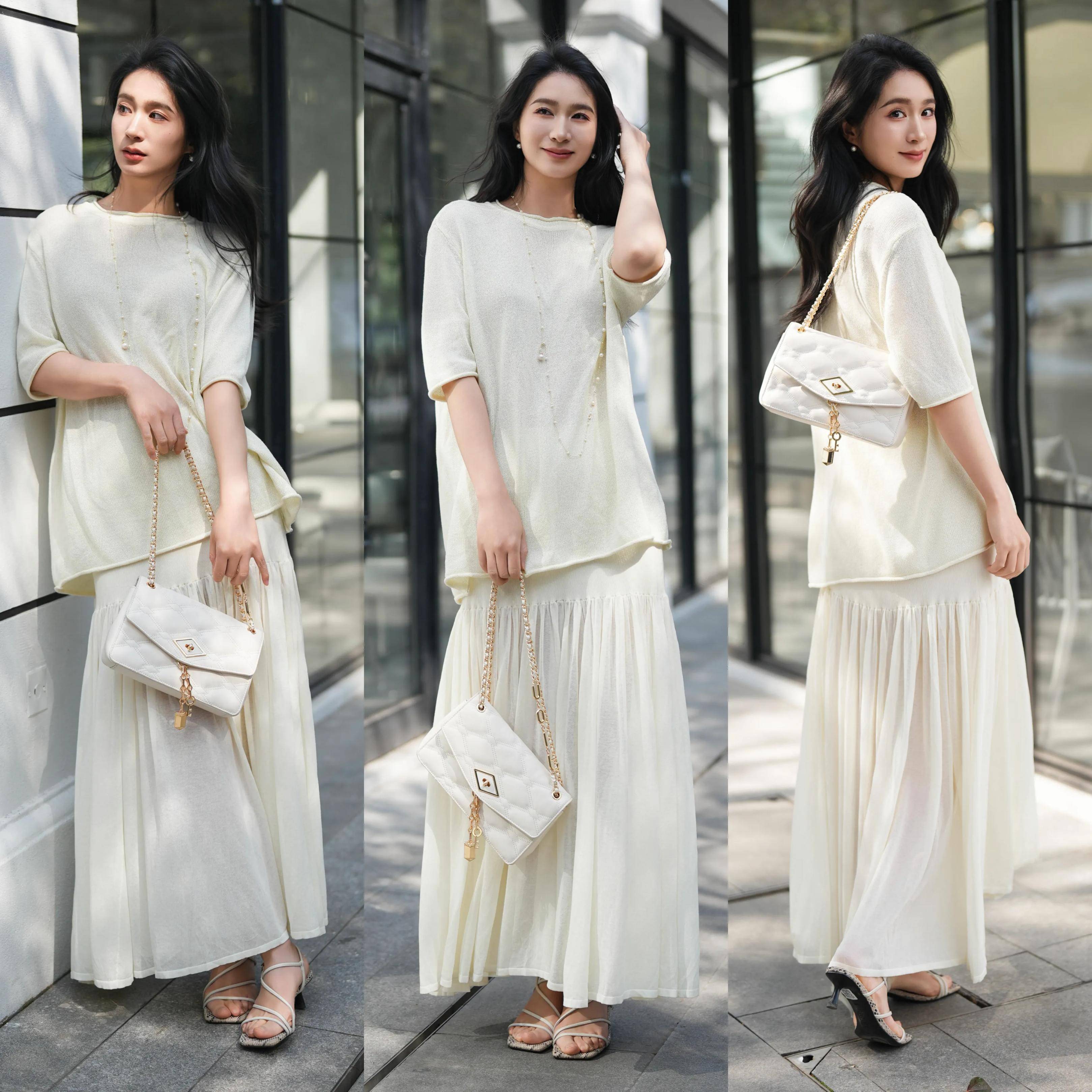 不是所有普通素人的身材都那么好,所以有胯宽腿粗尽量选择半裙,裙长过膝盖,脚踝卡在小腿肚位置,正好可以把身材缺陷全部遮住。