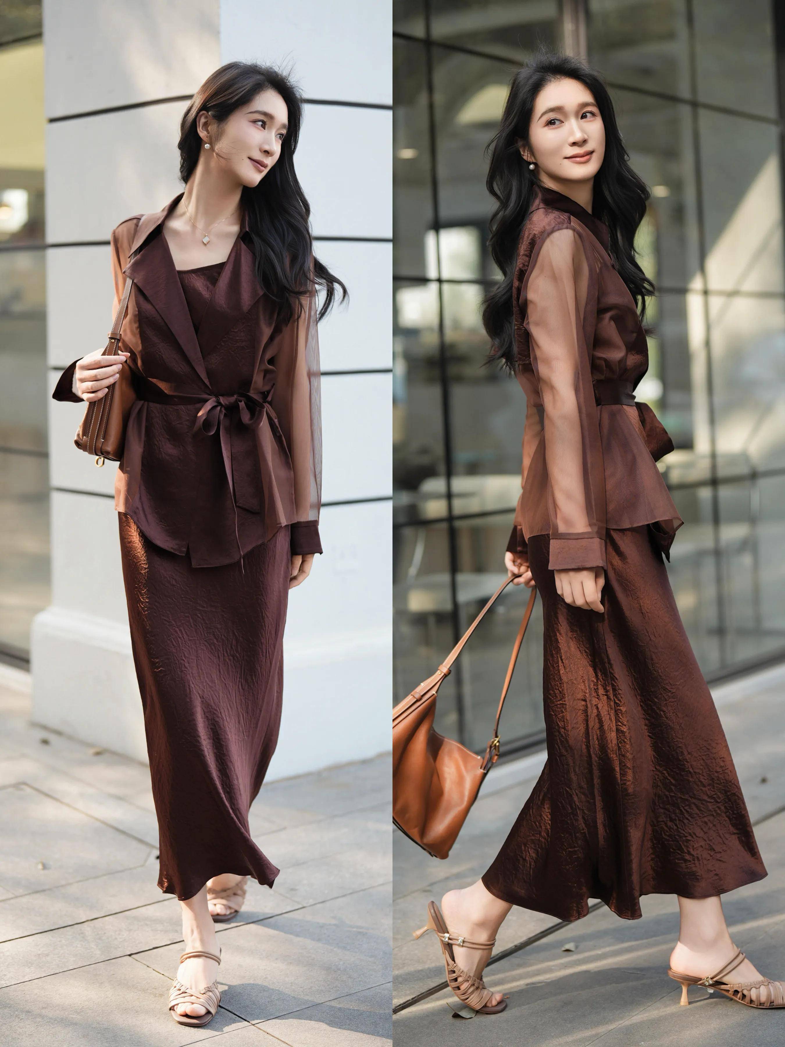 其实我们选择鞋子的时候,一定要根据整体的衣服色彩来选择,若是选择棕色的衬衫裙装来穿搭,这时候就用驼色的高跟凉鞋来搭配,最适配。正好和单肩包颜色形成呼应。能为春日的穿搭增添高级感气息,显贵又有氛围感。