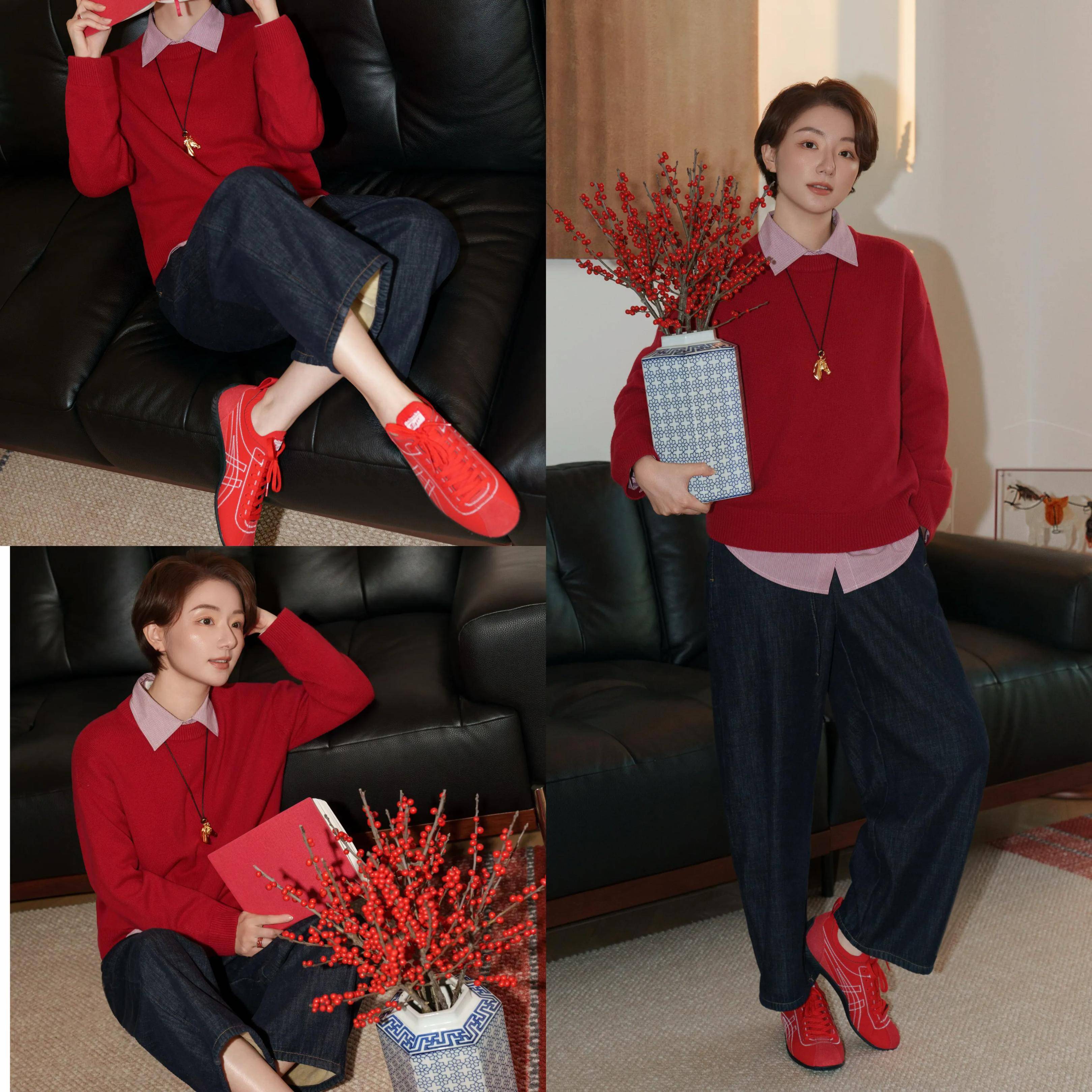 在这春季,让人看起来朝气蓬勃,复古又洋气。可选择一件红色的针织毛衣叠穿粉色衬衫,加上经典蓝色牛仔直筒裤,脚踩红色德训鞋,让人看起来显得很喜庆,活力感满满。