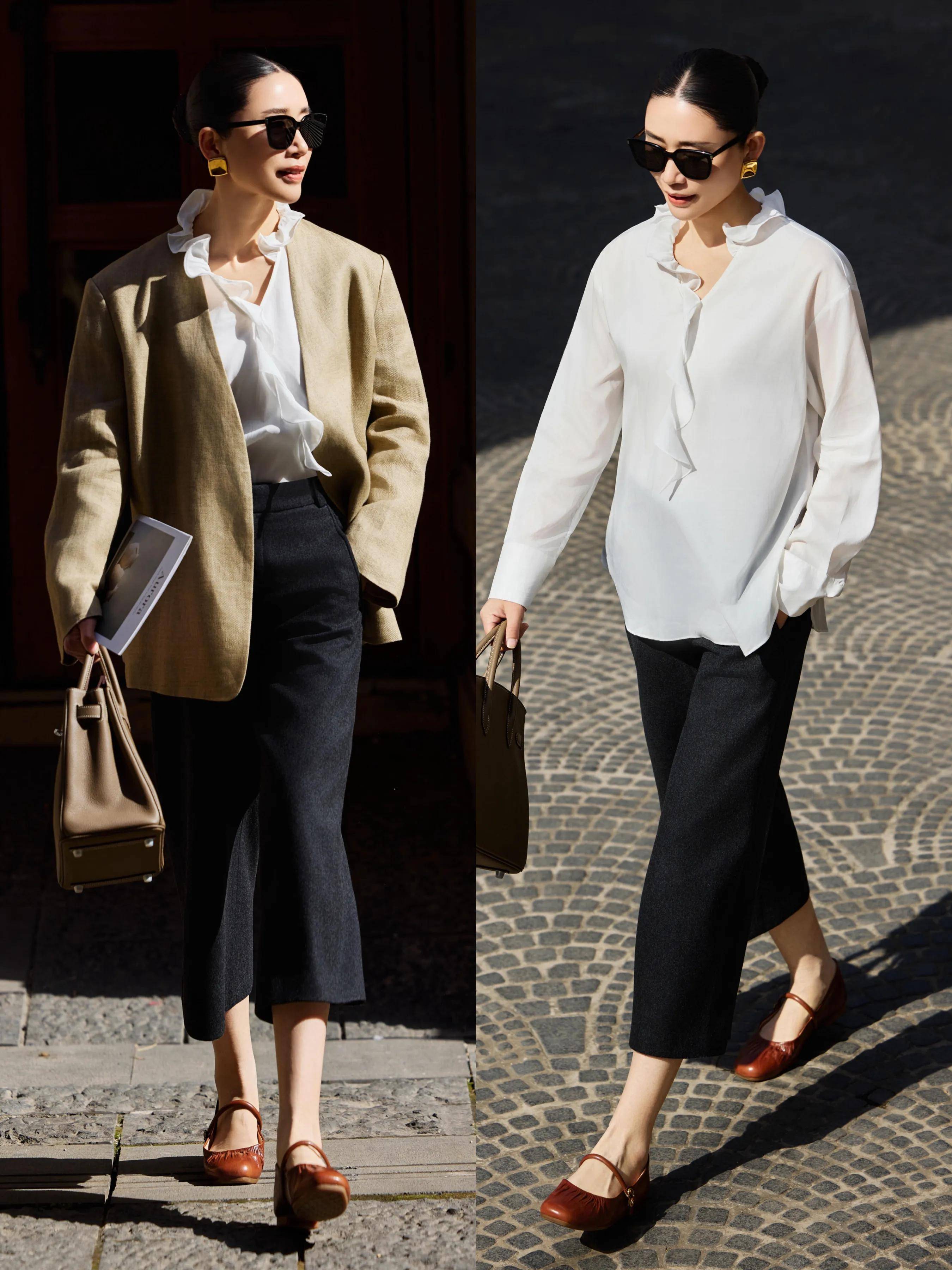 长相偏成熟大骨架女性,同样也可以穿一双比较有质感的玛丽珍鞋,例如上面就用了驼色粗跟玛丽珍鞋搭配黑色 6 分西裤,内搭木耳边白色小众衬衫,外披无领卡其色西装外套,走起路来气场全开,又飒又美。