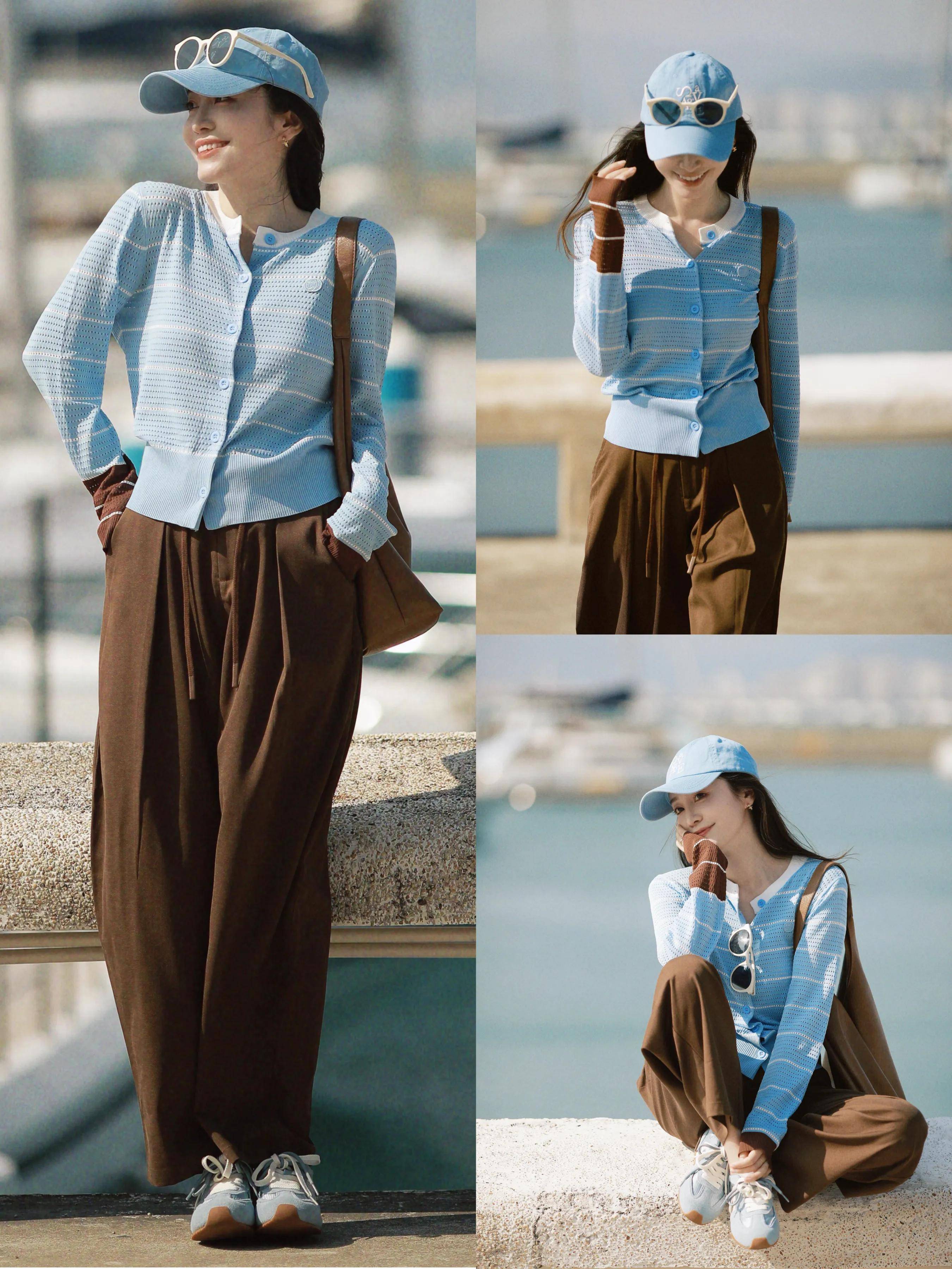 在春天真的就是要懂得配色技巧。比如我们选择棕色的西装阔腿裤。穿在身上整个人就显得很温润。脚上踩着一双雾霾蓝的德训鞋,正好和开衫棒球帽色彩形成呼应,这样的穿搭配色协调性很好,避免视觉杂乱。