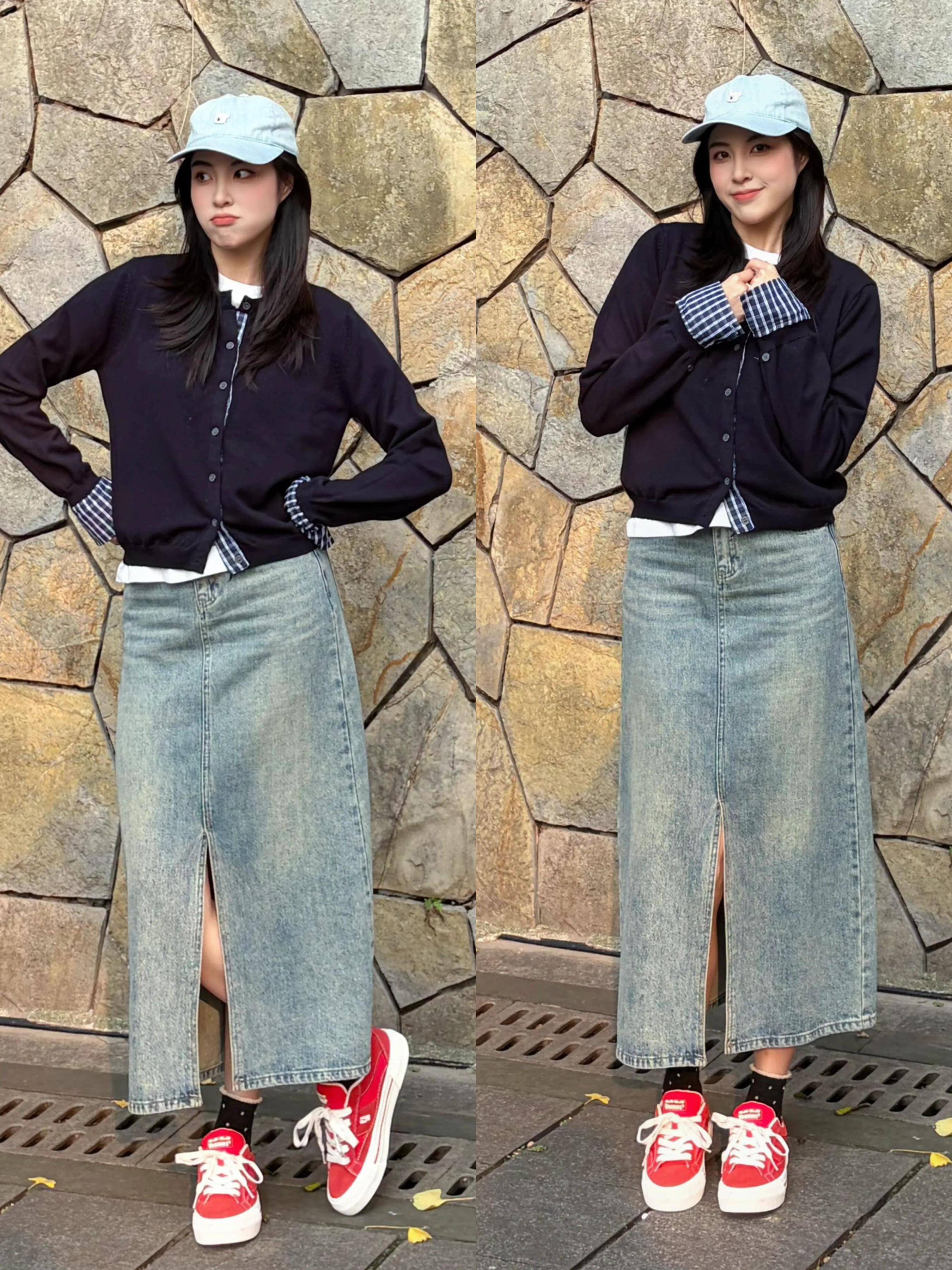 Tips②:针织衫+牛仔直筒半裙+红色帆布鞋