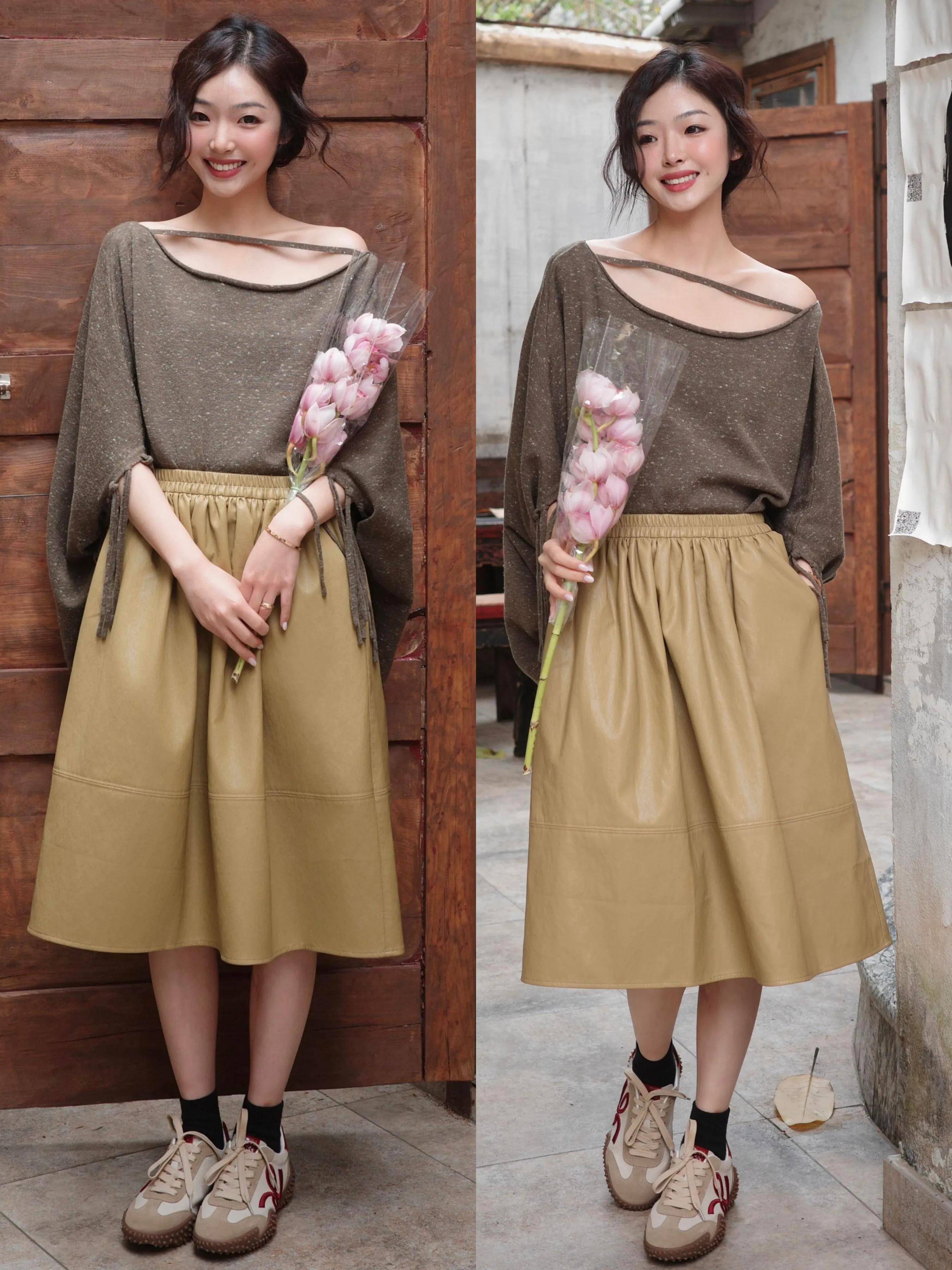 例如上面用一件燕麦色微宽松针上衣大搭配卡其色皮质半裙,脚踩一双燕麦色德训鞋,这种暖色系的衣服穿搭让人看起来更显活力。