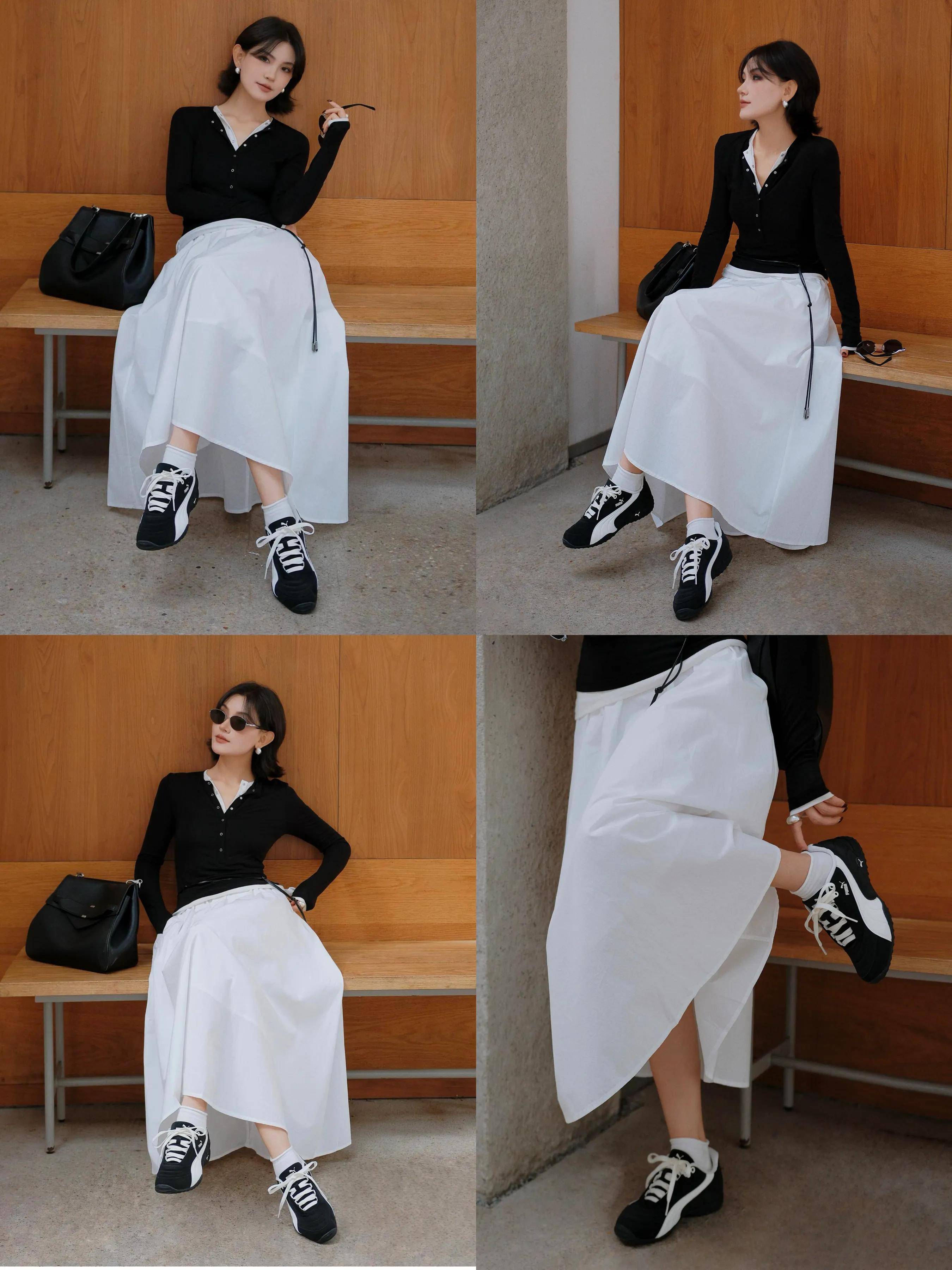 不过有的时候用黑色针织开衫搭配上白色伞裙,脚上穿的是一双黑白拼接的德训鞋,黑白色彩搭配,不挑人不挑肤色,经典耐看,永不过时,就算你明年拿出来穿,照样很美。