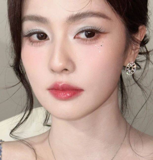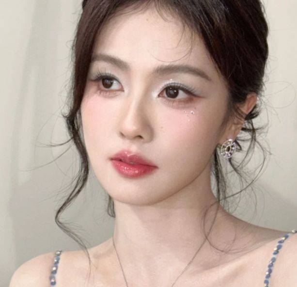闪片的运用是妆容的重点,但其应用逻辑非常克制。闪片元素通常被限定在几个关键区域:上眼皮中央、卧蚕、眼头,以及颧骨上方的一小片区域。闪片的颗粒度以极细为主,少见大颗粒的亮片。
