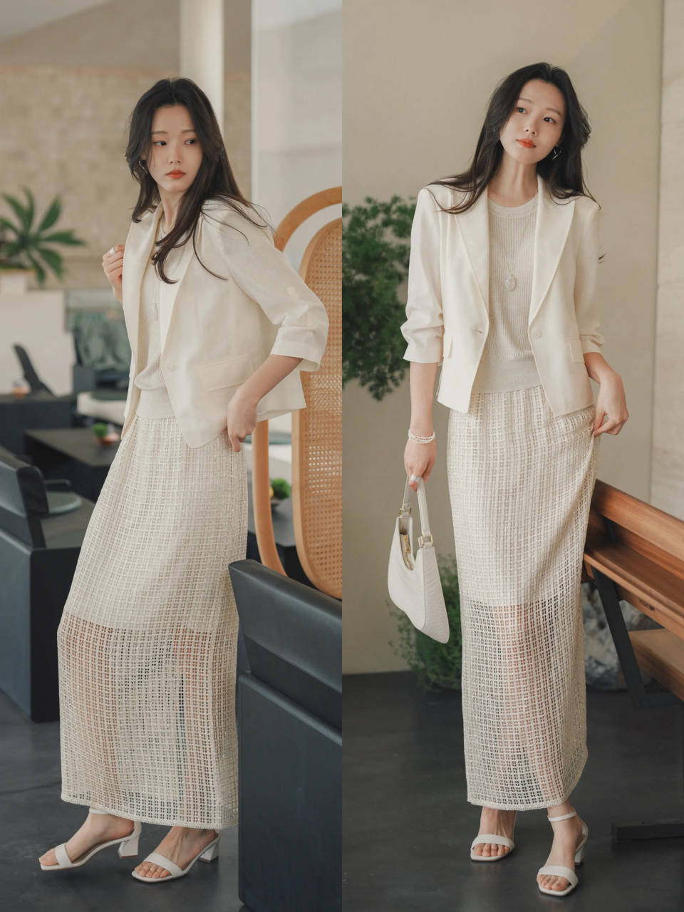 脚上就可以选择一双白色的低跟凉鞋来组合搭配,既能延伸腿部线条,又会更清爽。穿着上班通勤再适合不过了,身穿纯净的白色套装,立刻让你变得很高贵。