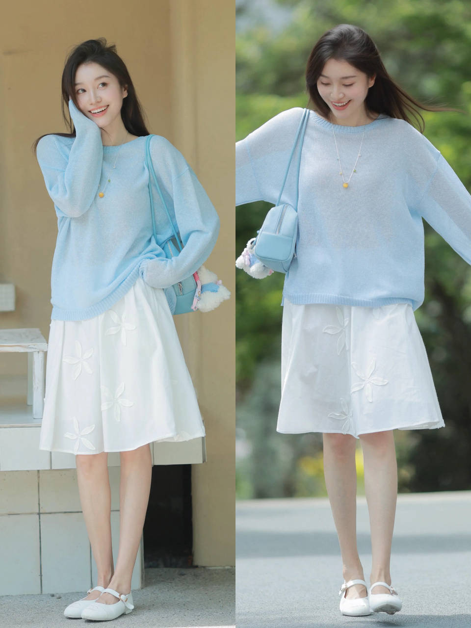 例如上面用雾霾蓝的针织上衣搭配上白色的刺绣伞裙和白色的玛丽珍鞋,即可让咱们变得温柔又有氛围感,显得很清爽。