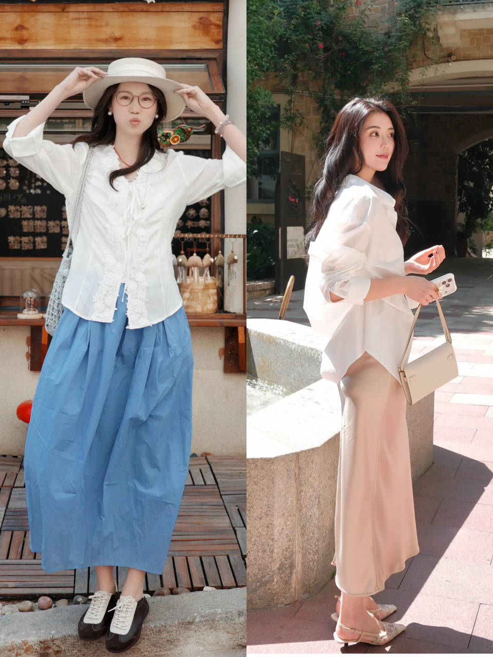 同样穿的是一件白色的衬衫,但是版型设计不同,穿在身上气质有很大的差异。