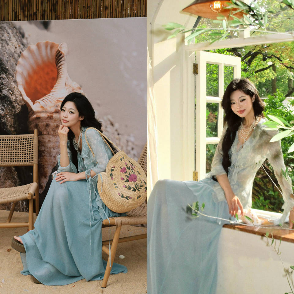 衣服颜色也很关键,在这春夏季节,想让自己拍出来的照片更清爽,可选择雾霾蓝的小众衬衫裙装,配上优雅的卷发造型,让你显得更雅致。