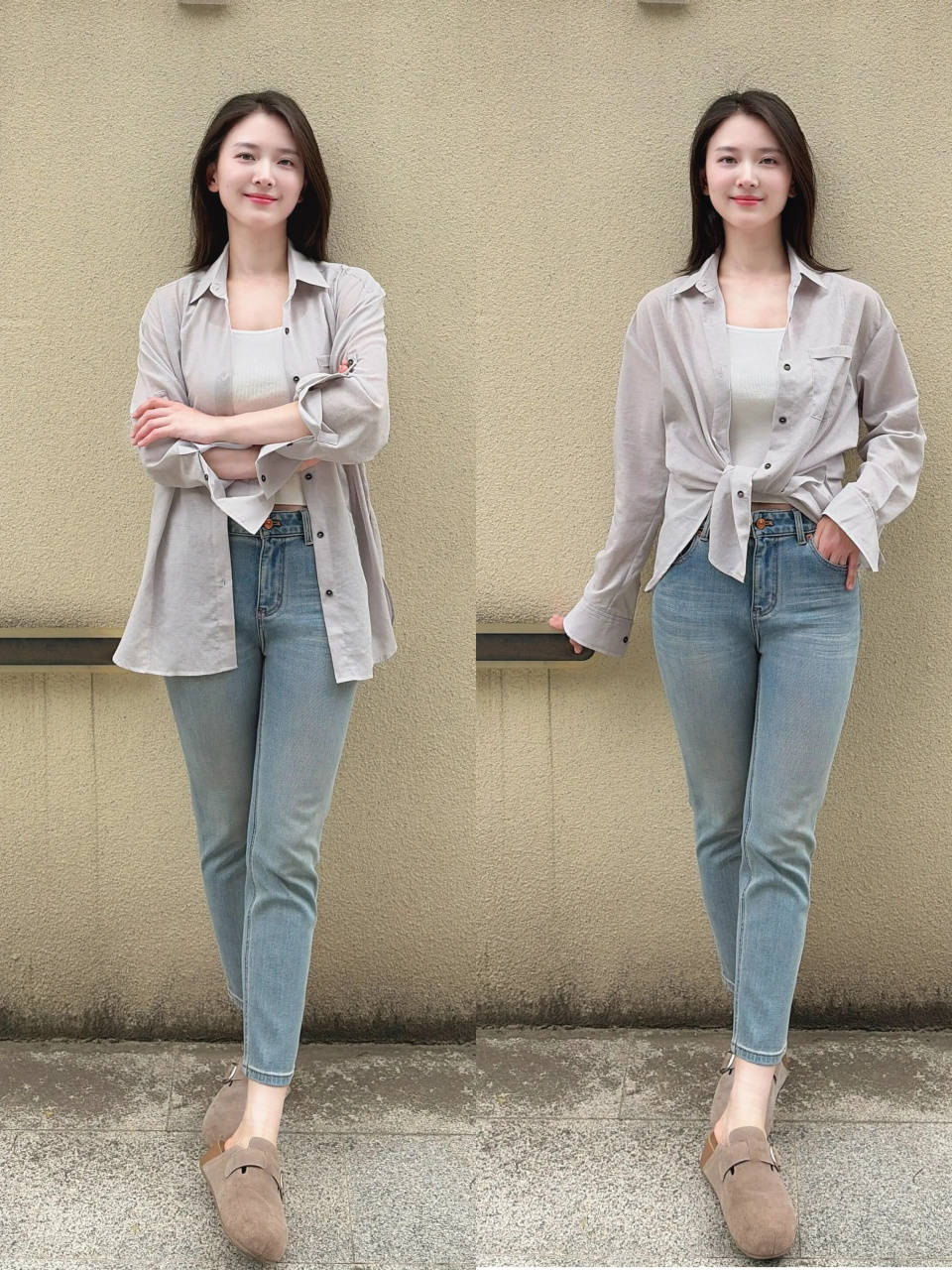 配上蓝色的牛仔九分裤和一件衬衫上衣,既清爽又利落。