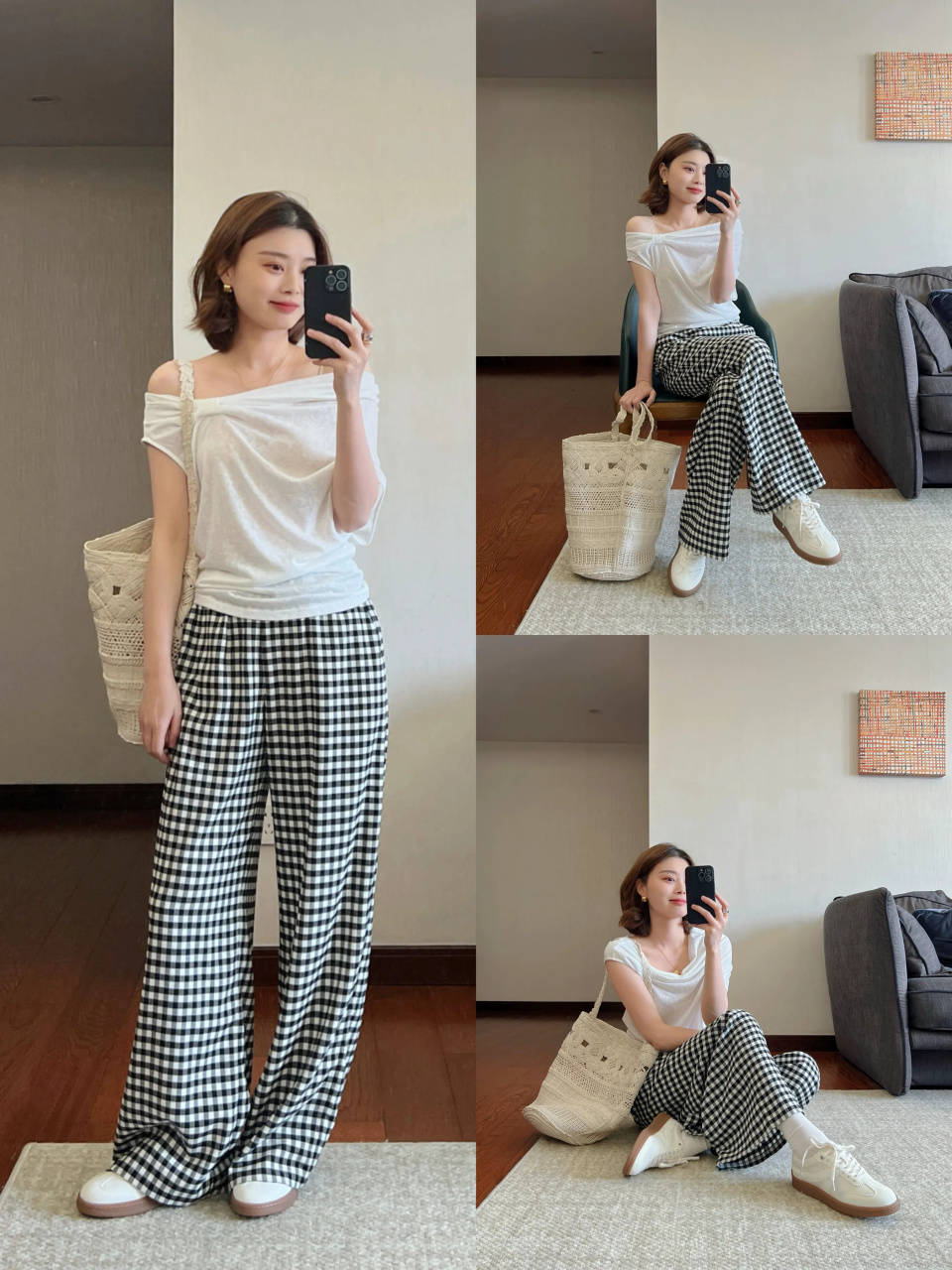 当我们穿的是一条格纹的直筒阔腿裤,脚上可以直接选择一双小白鞋来组合搭配,弱化穿衣造型的休闲感,让穿搭者干练又时髦。
