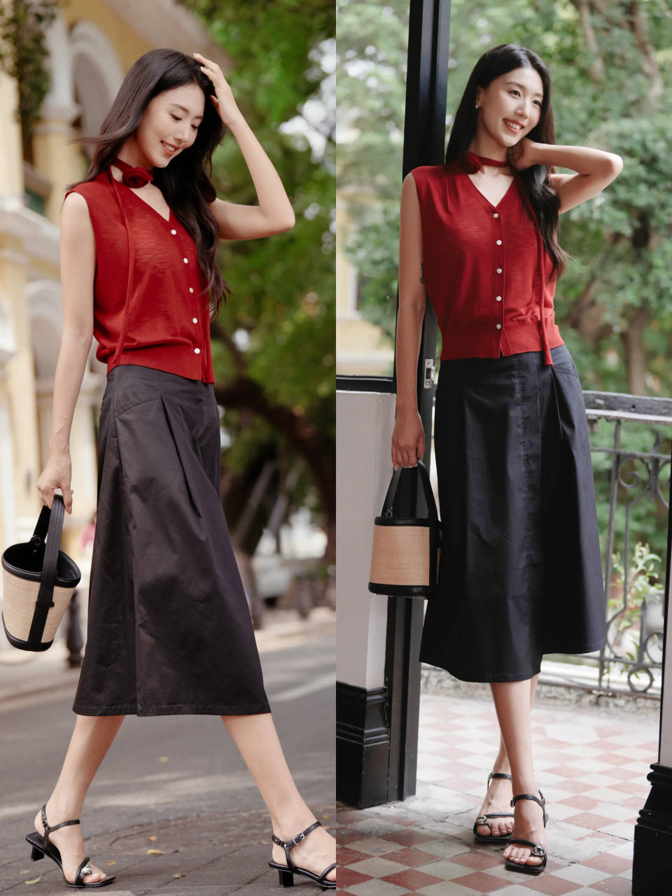 当我们穿的是黑色的高跟凉鞋时,直接选择黑色的半身裙来组合,顺色搭配确实更好看,不易出错,但我们想要造型更有朝气,选择红色的无袖针织开衫来组合,才能打破。穿衣造型的沉闷与枯燥,让咱们的造型朝气蓬勃。