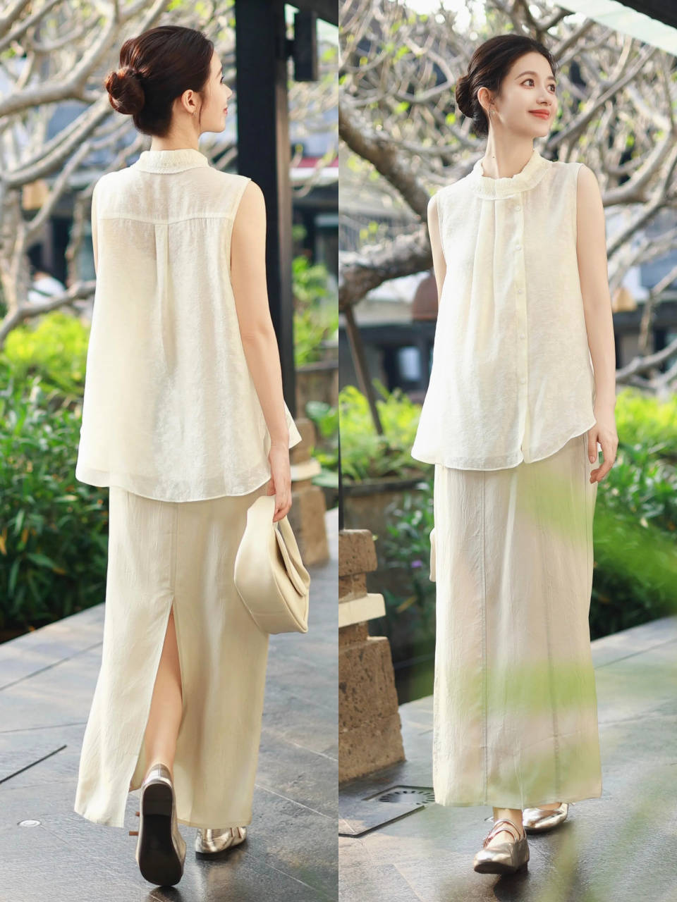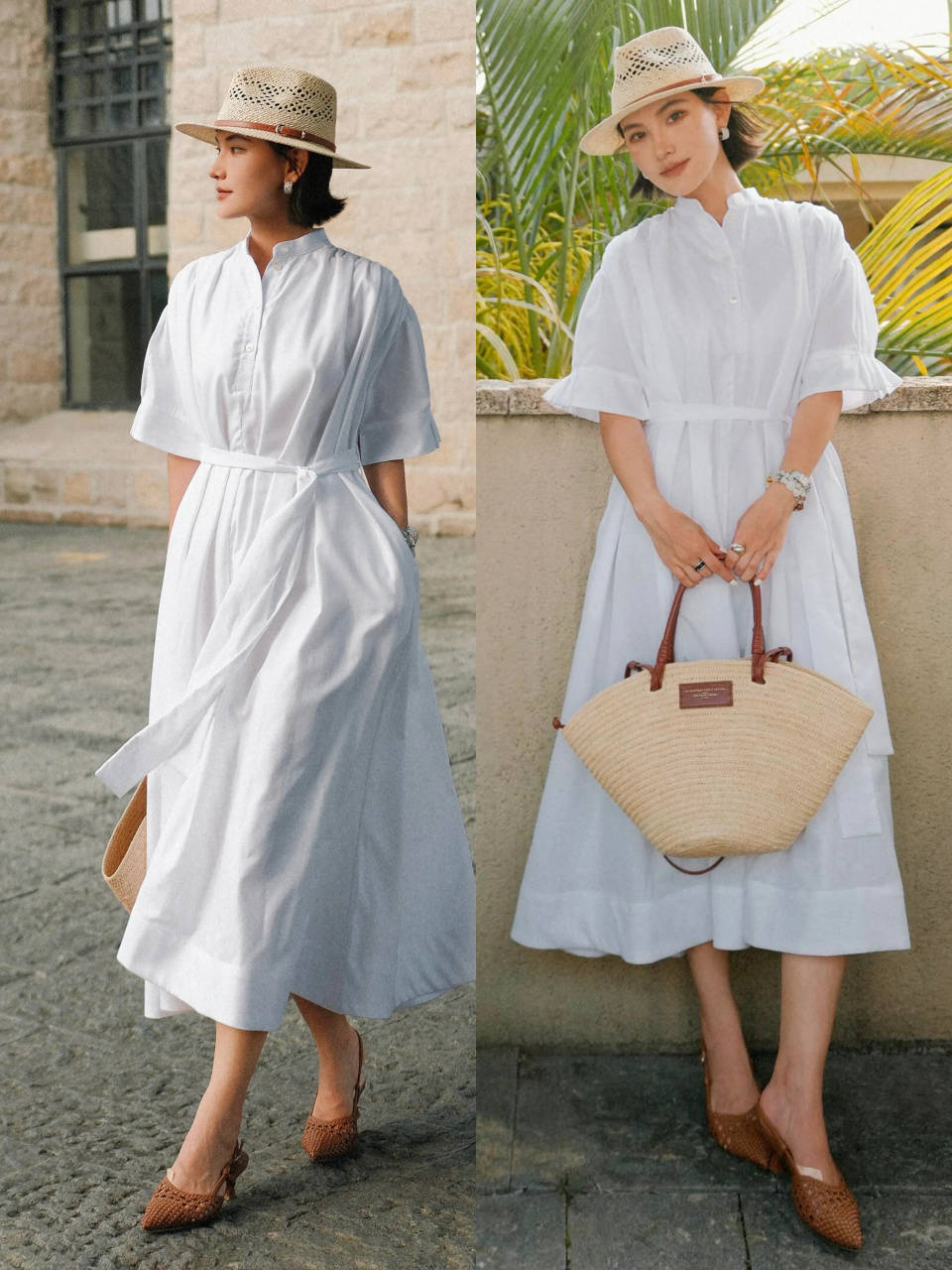 再配上白色的小众设计薄纱裙装,轻柔飘逸,展现效果自带一种松弛优雅的气场,咱们普通素人照着穿也格外的动人。