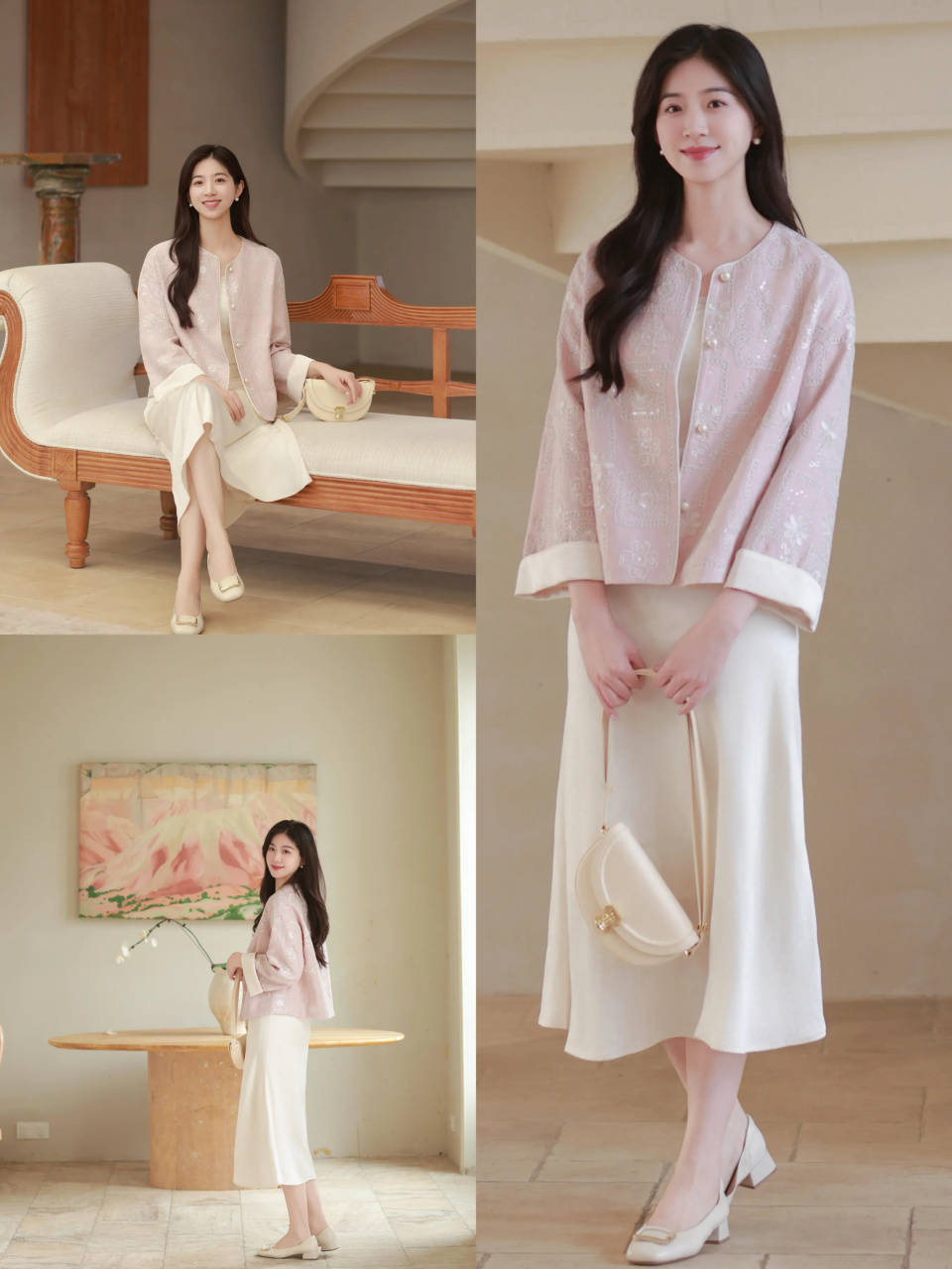 要是当天出门和男友约会,想要提升自己的精致感,同时要自带少女气息,可选上面这种粉色的小香风外套,搭配上白色的连衣裙,外短内长的穿搭,更好地修饰出三七分的身材比例。