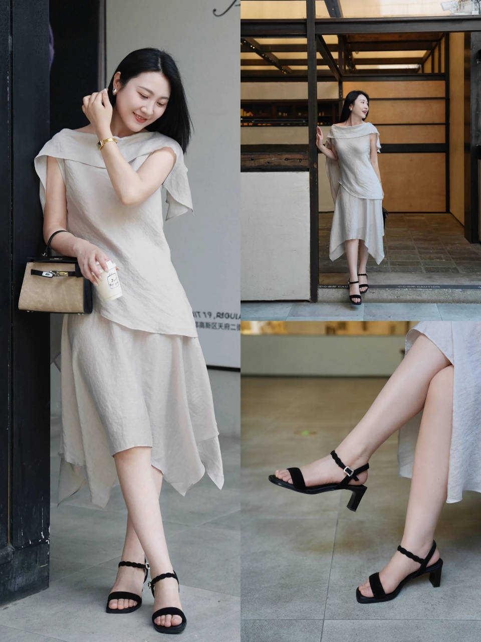 例如上面这位时尚博主就选择了一双大地色系的浅口粗跟单鞋露出脚面悄悄地延伸腿部线条感,再配上一条白色的无袖连衣裙,优雅又有御姐风范。