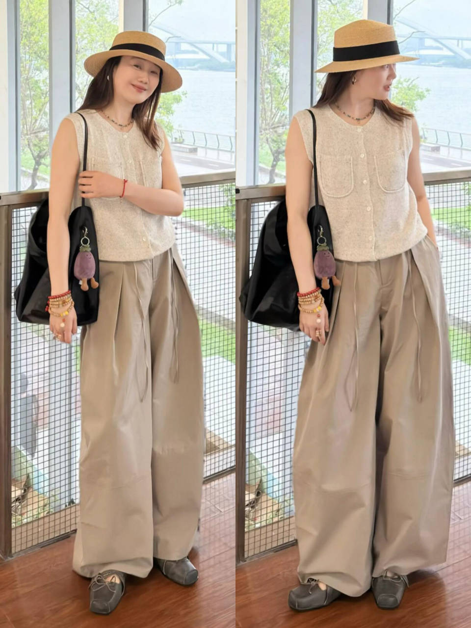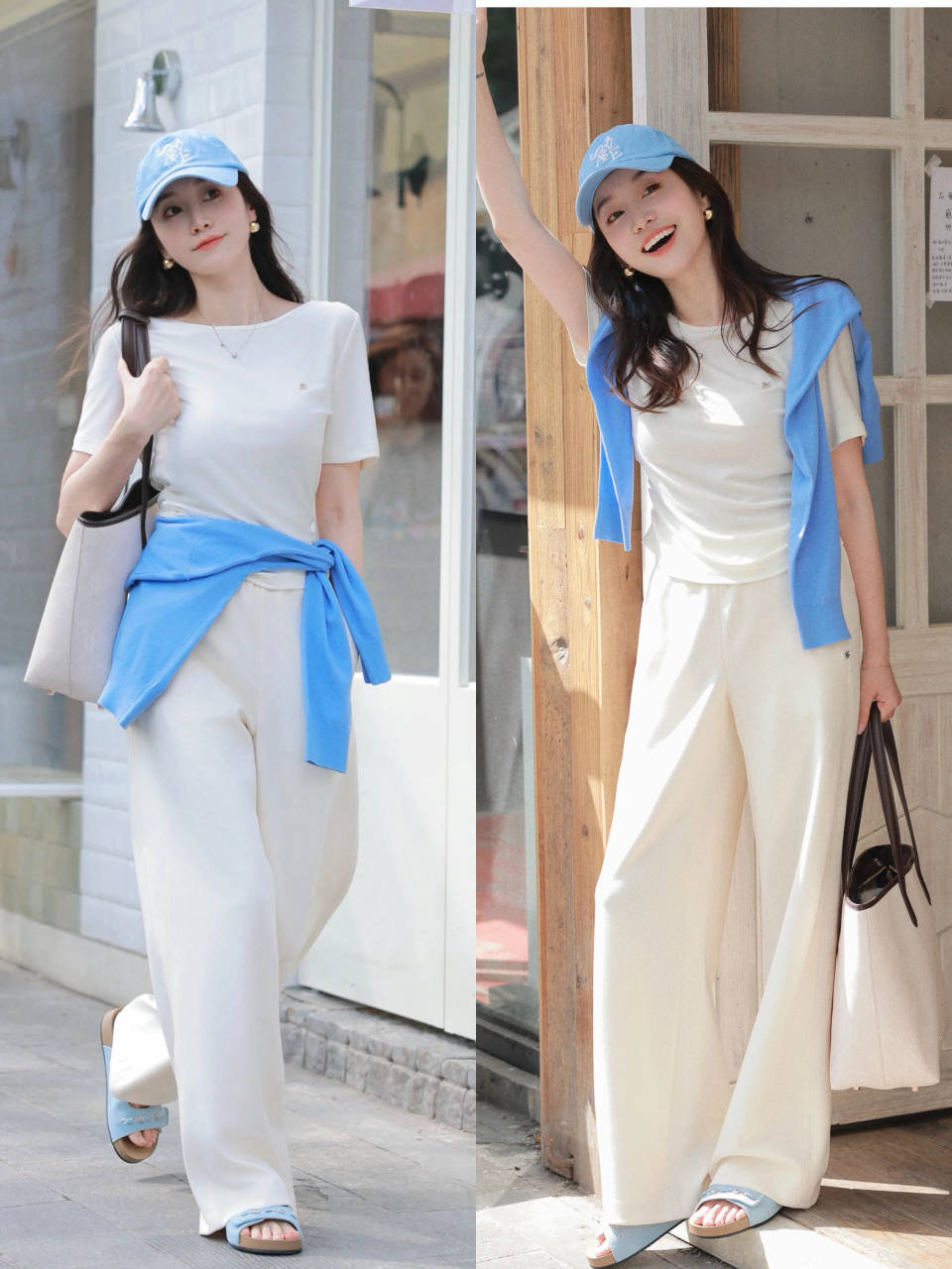 休息天的时候出门逛个街,我们可以选择一双淡蓝色的凉拖鞋,配上白色的直筒阔腿裤和白色短袖上衣,再披上一件淡蓝色的针织上衣,正好和鞋子形成色彩呼应。