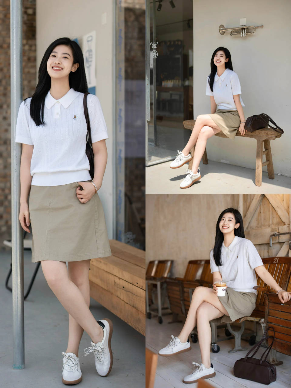 当然也可以选择一双经典的灰白拼接色德训鞋,配上卡其色的直筒短裙,配上白色的 polo 衫短袖上衣,这样的穿衣风格既休闲又有活力感,元气满满。