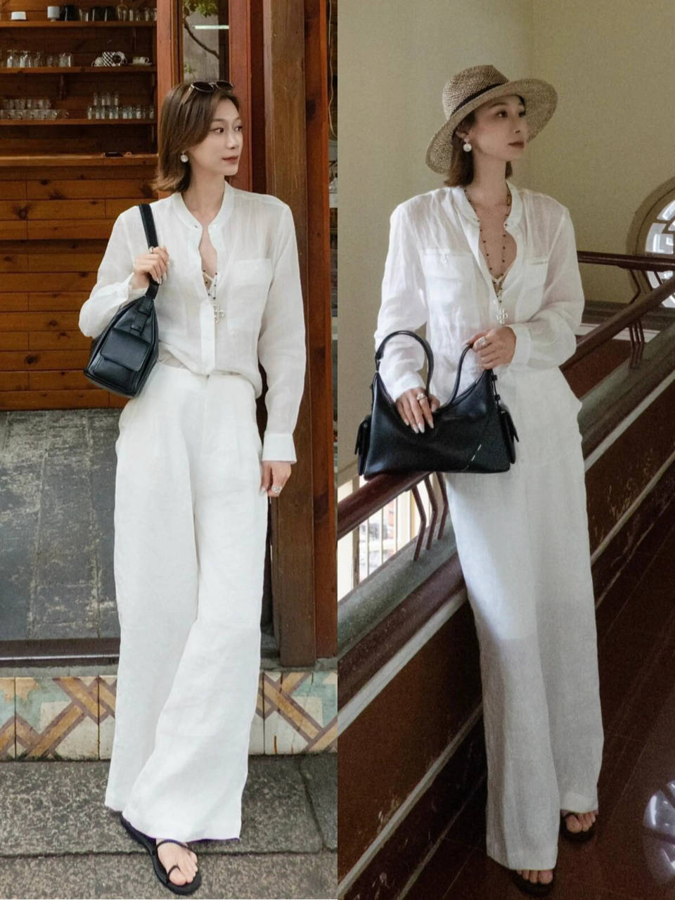 拥有高挑纤瘦身材的你,不妨还可以直接选择一双黑色的平底凉拖鞋,配上白色的阔腿裤和一件白色衬衫,利落又有气场,还能为日常穿搭注入了休闲与活力。
