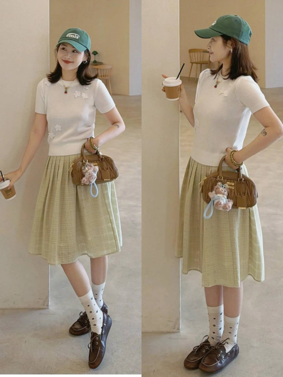 穿着一条高腰收腰的伞裙和白色的针织短袖,这一身穿搭既优雅又有活力,简约大气不张扬。