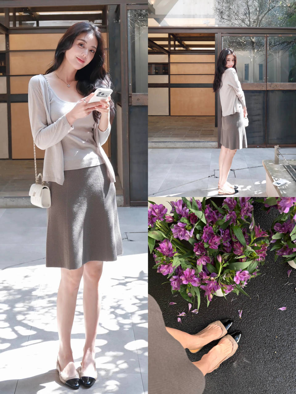 若是想要呈现优雅温柔的女人味,不妨选择上面这双黑色与卡其色拼接的浅口玛丽珍鞋,配上一条灰色的半裙和针织开衫,结合一头优雅的卷发造型让你轻松拿捏春夏季节的优雅穿衣造型。