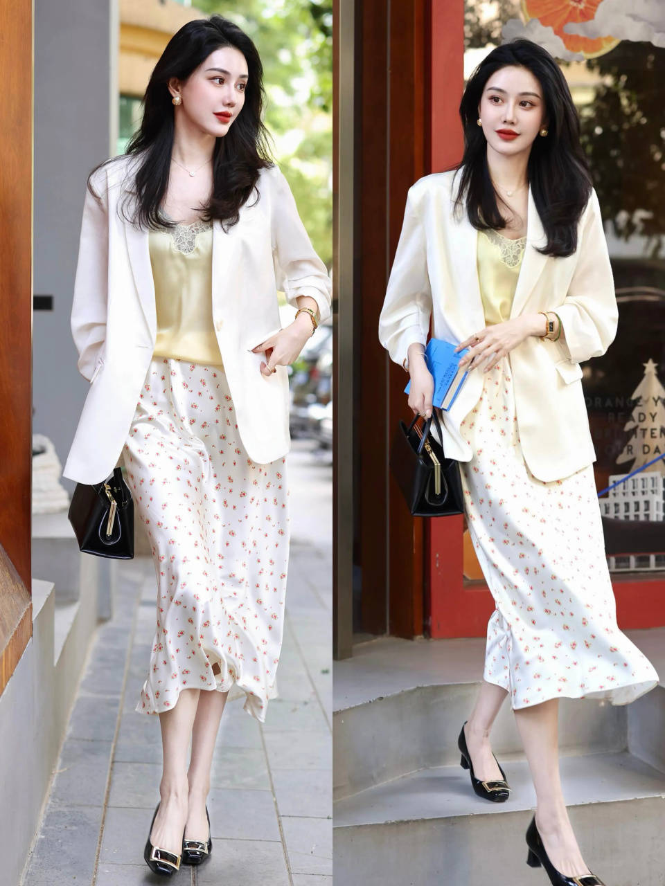 黑色的鞋子确实最百搭,毕竟是属于基础色调,但想要穿出不一样的高级质感,可以像上面这位时尚达人一样,用粉白波点半身裙和一件白色西装外套,内搭浅鹅黄色的吊带上衣组合,利落又优雅,这样的配色不沉闷,反而很高级。