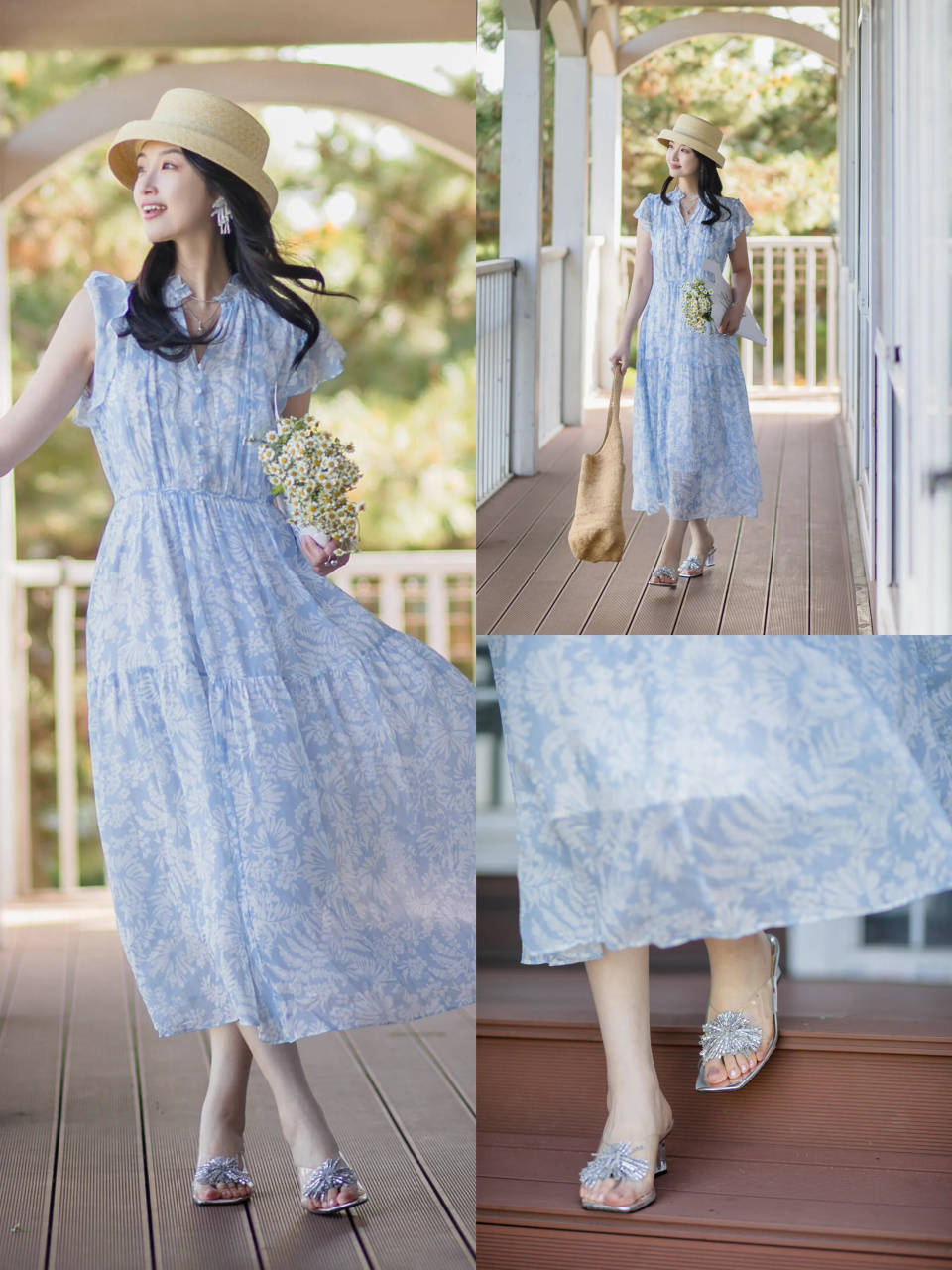 配色②:银灰色高跟凉鞋配淡蓝色碎花连衣裙,清爽优雅