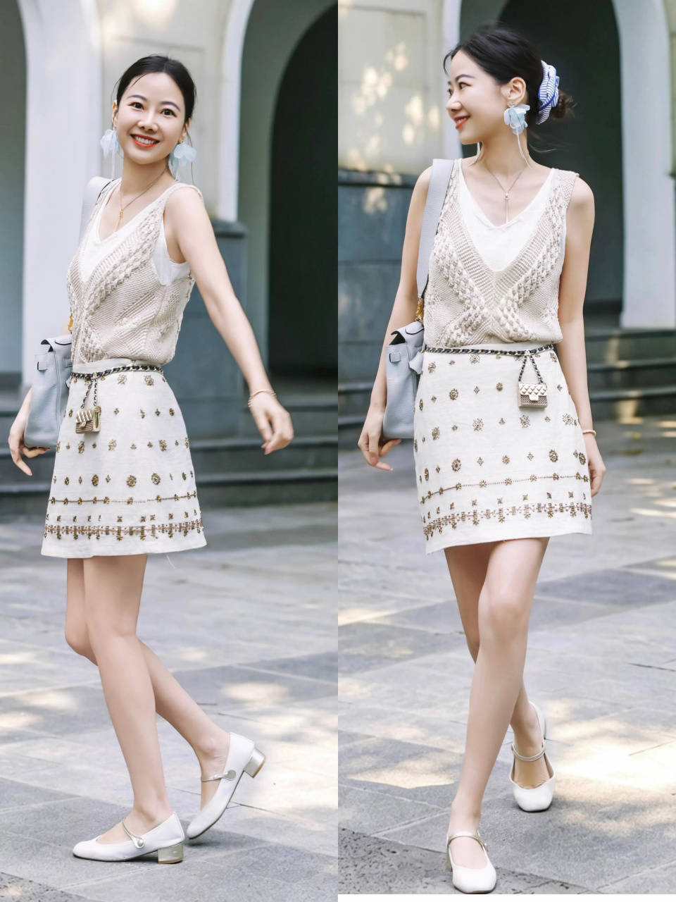 或是直接选择一双白色的粗跟玛丽珍鞋,配上印花刺绣的短裙和针织吊带上衣,这样的穿衣风格能更好地呈现出你凹凸有致的身材比例,呈现大长腿优势,抢眼吸睛,日常穿搭,上班,逛街,约会都适配,多场景可应用。